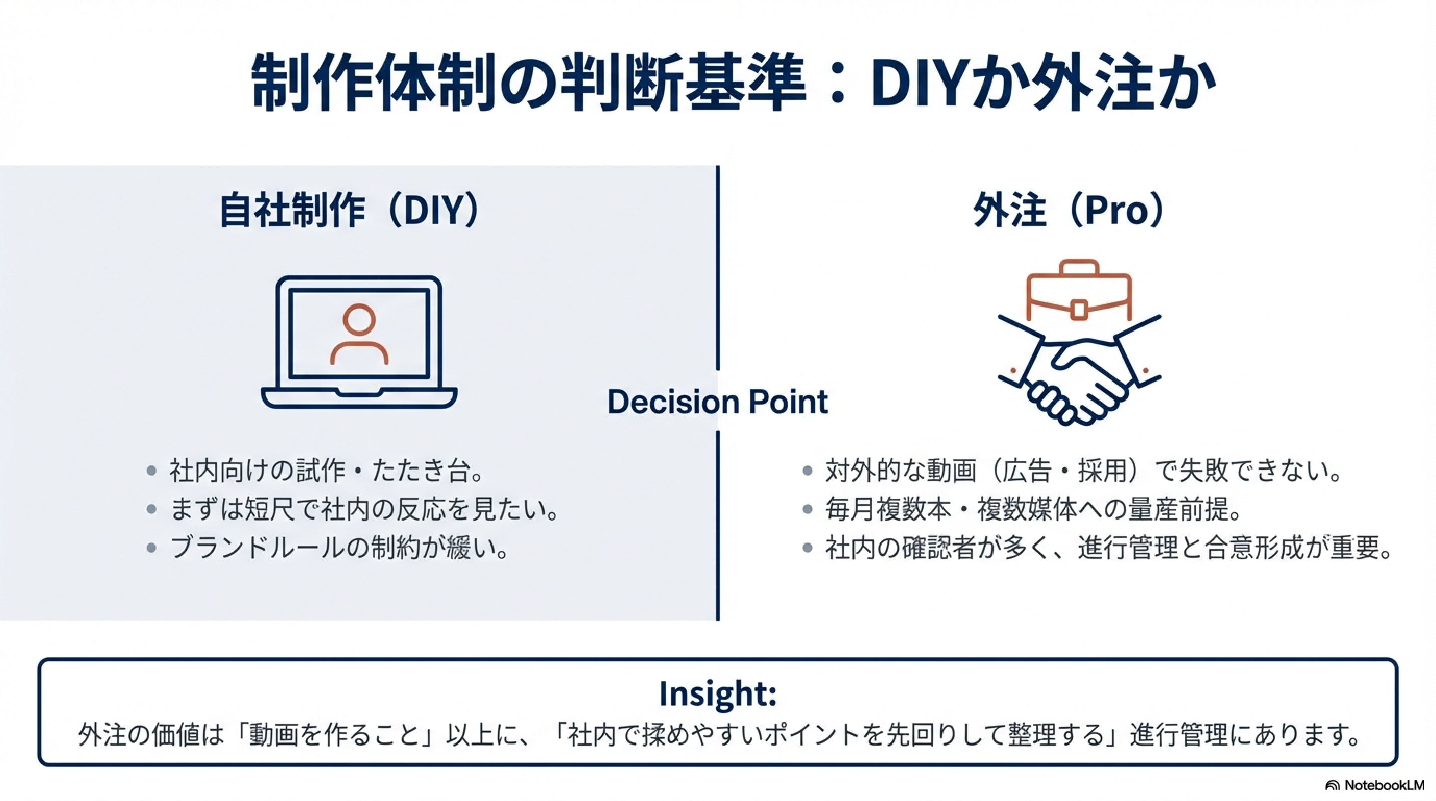 ただし企業動画は、品質の再現性(毎回同じレベルで作れること)と、社内説明のしやすさ(なぜこの表現なのか説明できること)が大事です。